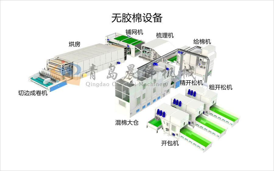 開包機(jī)-開松機(jī)-振動(dòng)給棉機(jī)-梳理機(jī)-鋪網(wǎng)機(jī)-烘房-切邊成卷機(jī)