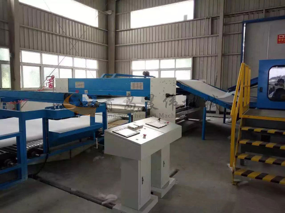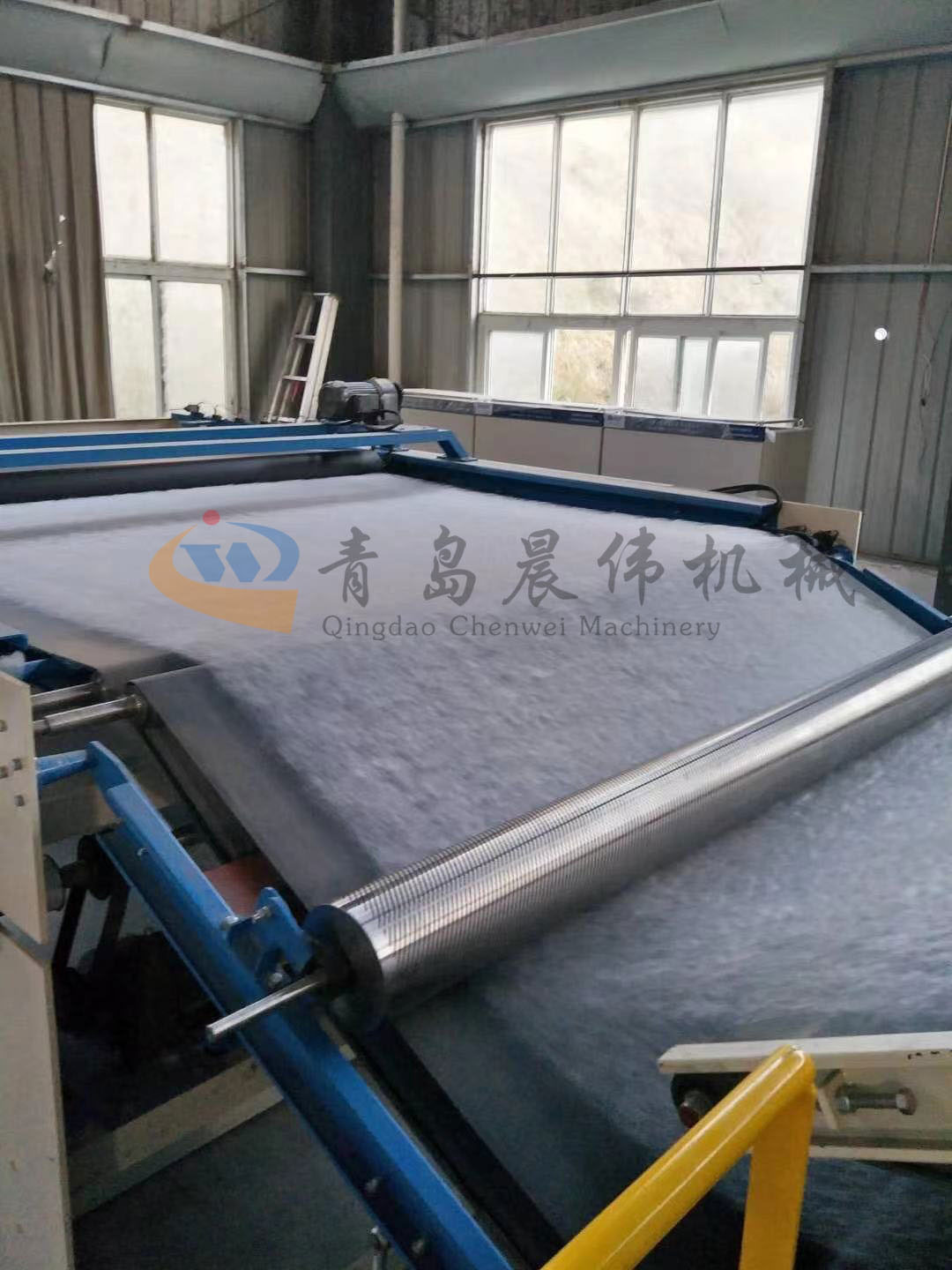 5. CWPW-鋪網(wǎng)機(jī):用于將梳理纖網(wǎng)通過移動(dòng)小車交叉折疊為所需幅寬和定量的多層纖網(wǎng),以供后道工序使用。鋪網(wǎng)輥采用特殊結(jié)構(gòu),加裝壓網(wǎng)輥和導(dǎo)流板,不飄網(wǎng)不起皺,五只大功率電機(jī)精確控制各部件的運(yùn)動(dòng),電動(dòng)輸出簾高度調(diào)節(jié)裝置
