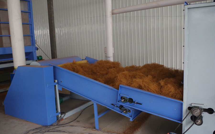 2. CWKS-開松機:各種不同纖維被放入水平輸送簾,經壓棉輥和對輥羅拉喂入,經高速打手開松后經輸棉風機以適量的風量輸送纖維原料供后道工作使用;并配備橋式除鐵裝備。開松效果好,不易纏棉,產量高。