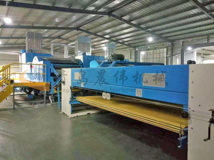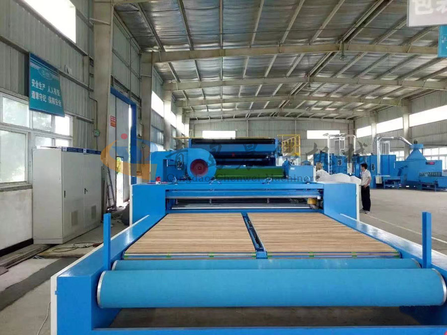 5. CWPW-鋪網機:用于將梳理纖網通過移動小車交叉折疊為所需幅寬和定量的多層纖網,以供后道工序使用。鋪網輥采用特殊結構,加裝壓網輥和導流板,不飄網不起皺,五只大功率電機精確控制各部件的運動,電動輸出簾高度調節裝置